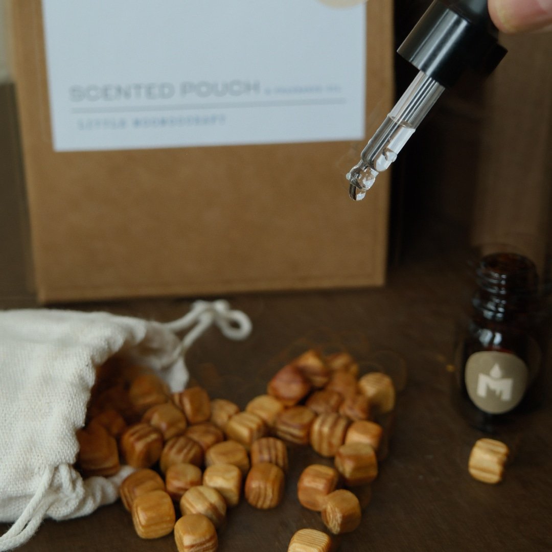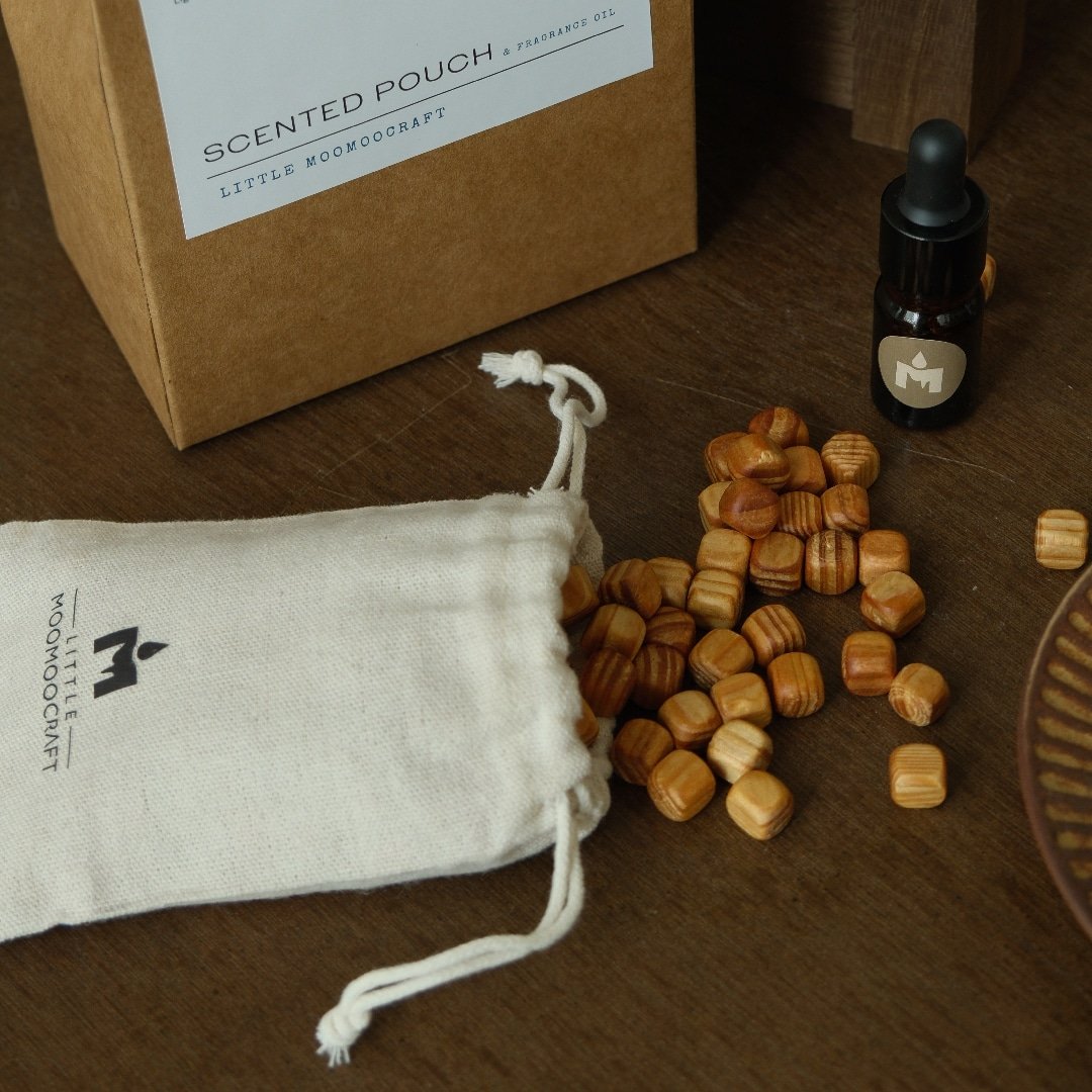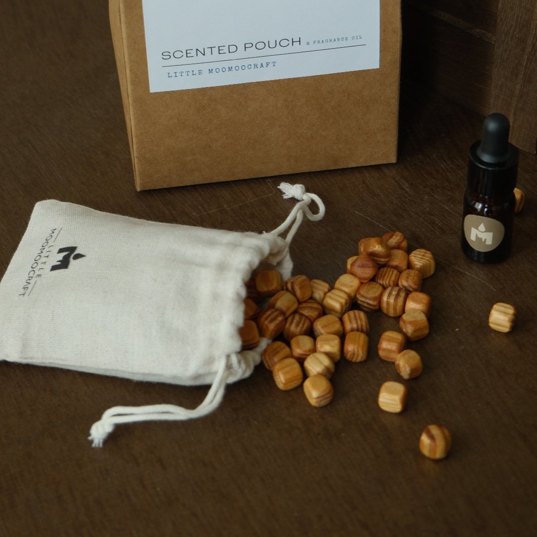 Filled with wooden beads and paired with a fragrance oil, each pouch slowly releases its scent over time, creating a soft and comforting atmosphere. Place it in your wardrobe, drawer, bag, workspace, or car to enjoy a subtle fragrance that feels warm and personal.