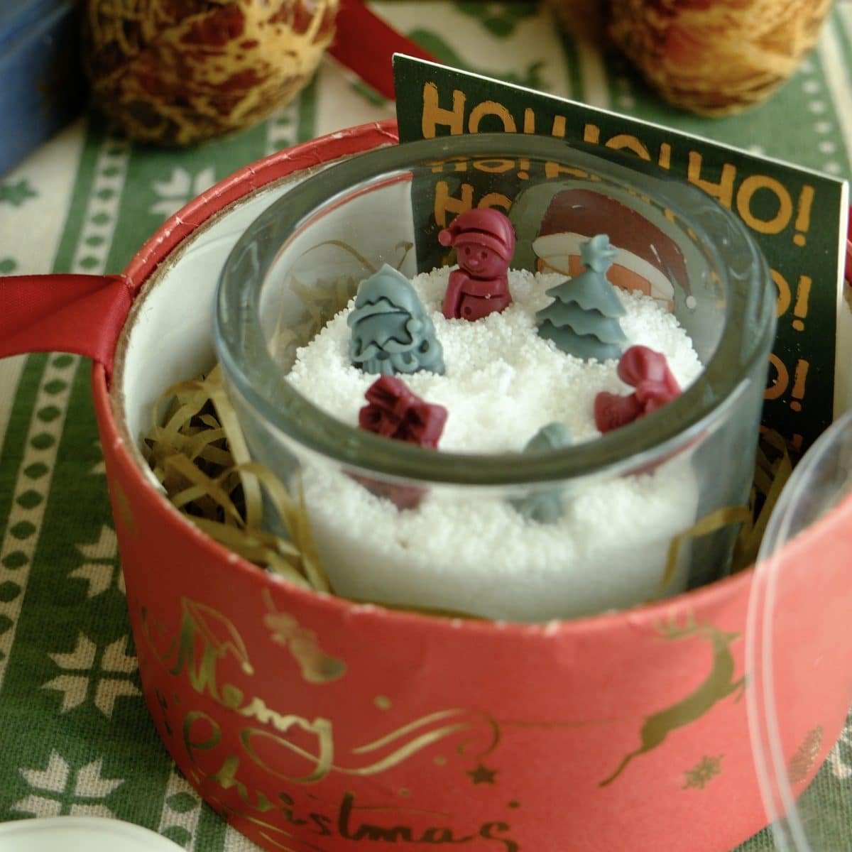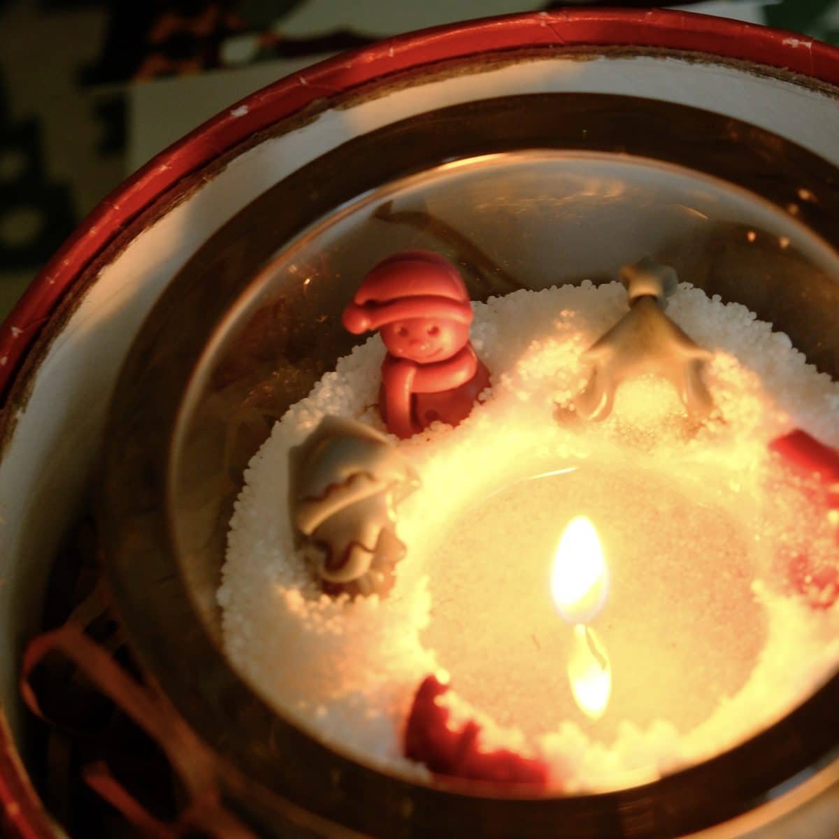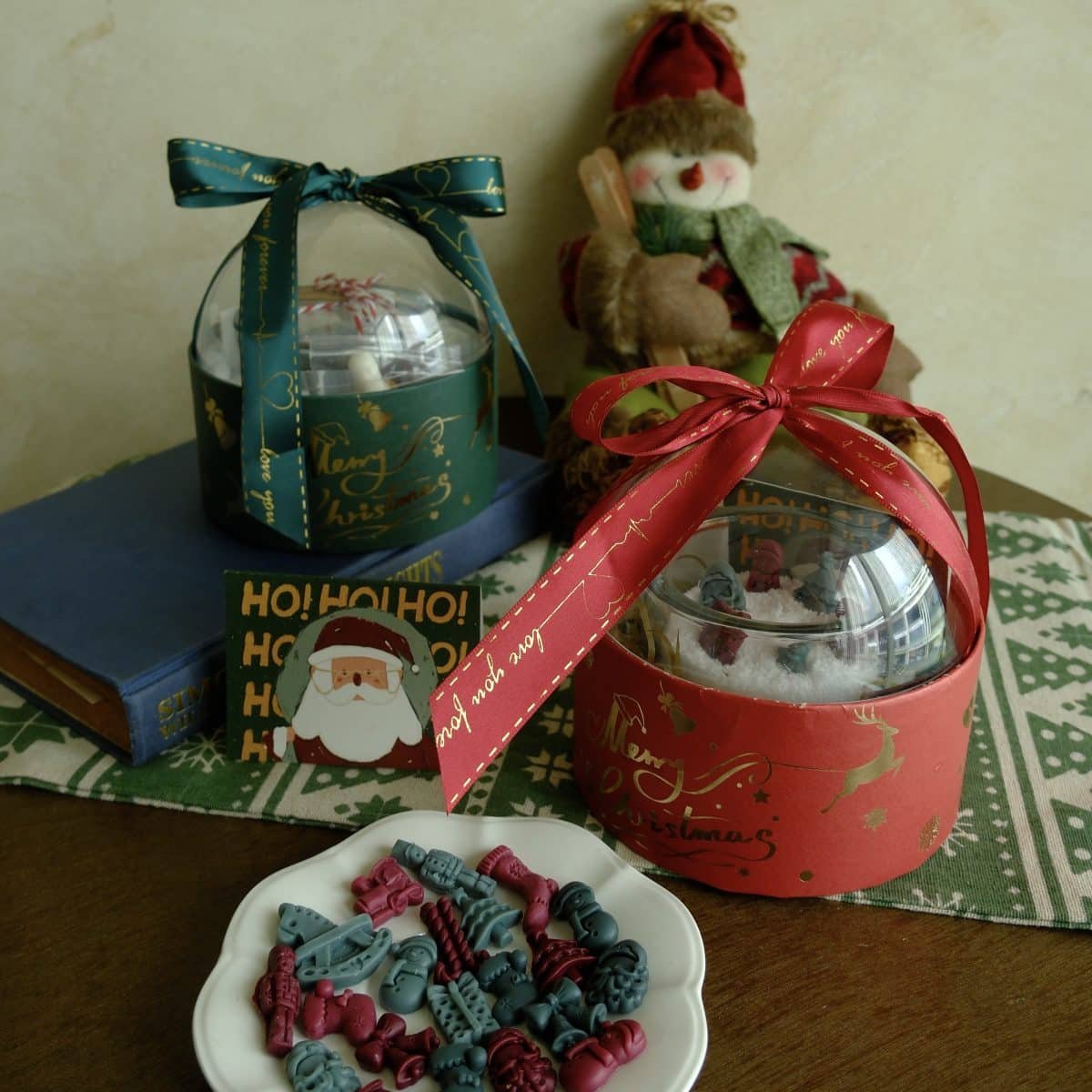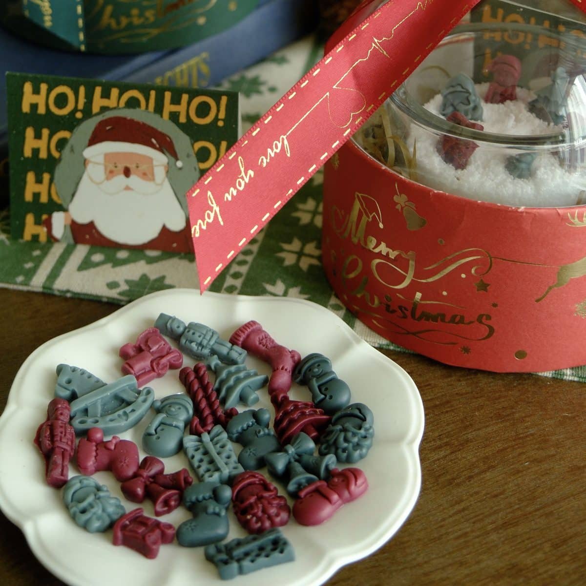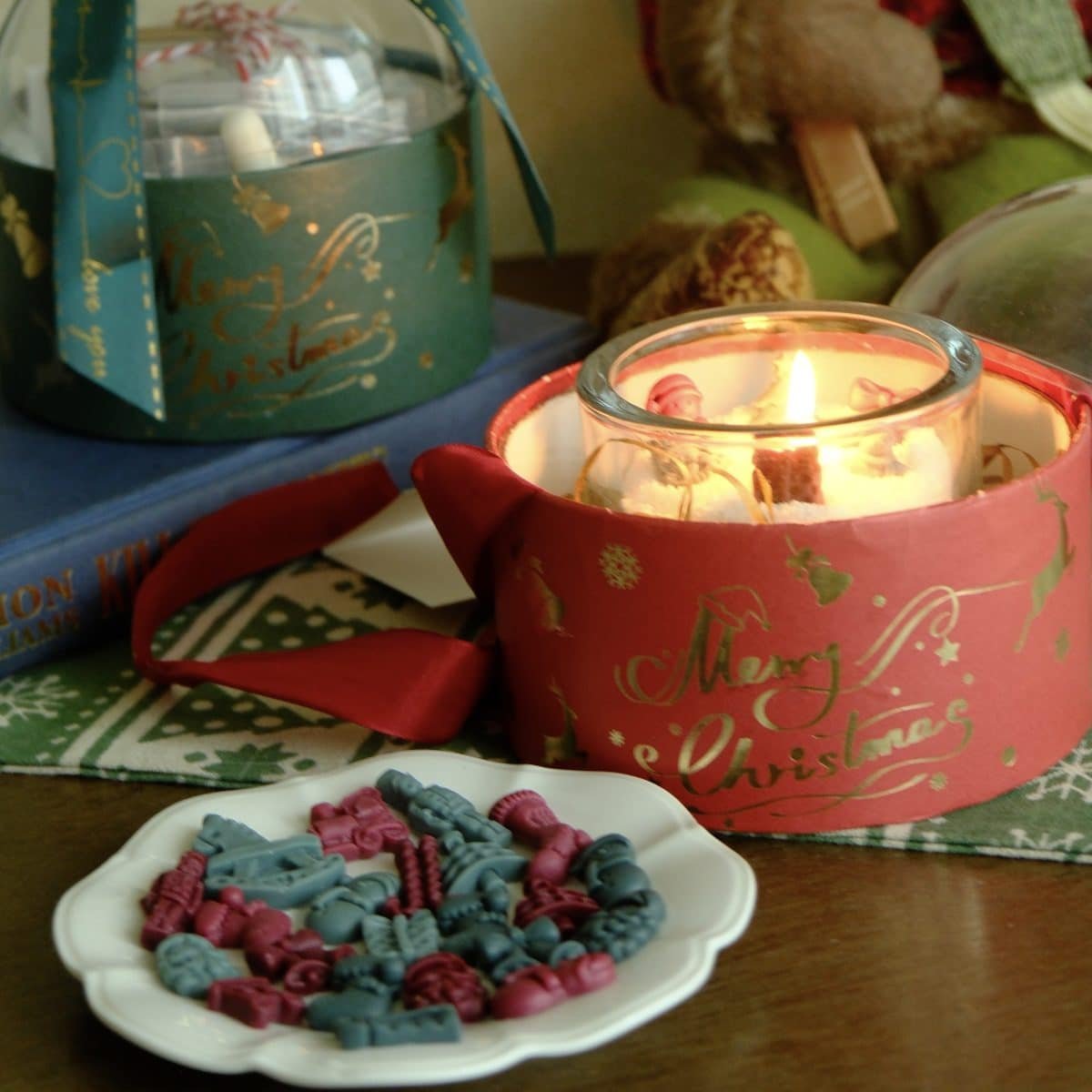 Cute Christmas-themed wax pieces you can arrange on top, tiny trees, bows, presents and more.